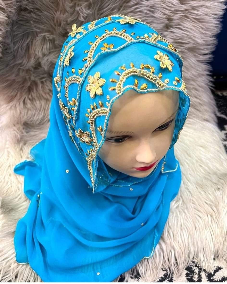 Beautiful African Designer Firozi Color & Gold Beaded Head Scarf for Women